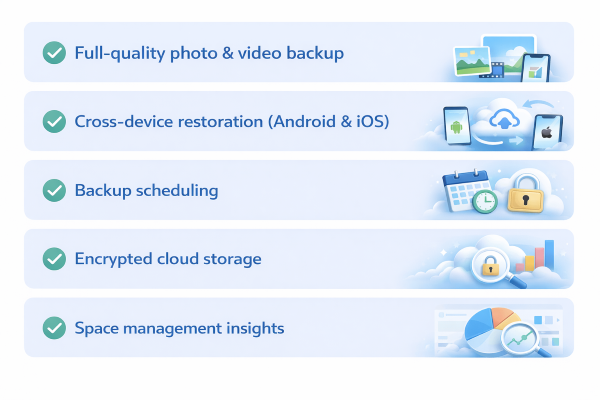 Holiday seasons typically generate a spike in photos, videos, and chat media. This increase often leads to overloaded devices, reduced performance, and slower app behavior as the new year begins. A structured phone storage cleanup not only boosts performance but also keeps important memories safe. With G Cloud Backup, users can securely store full-quality media in the cloud, free up local storage, and enjoy a smoother mobile experience without risking data loss. (Learn more)